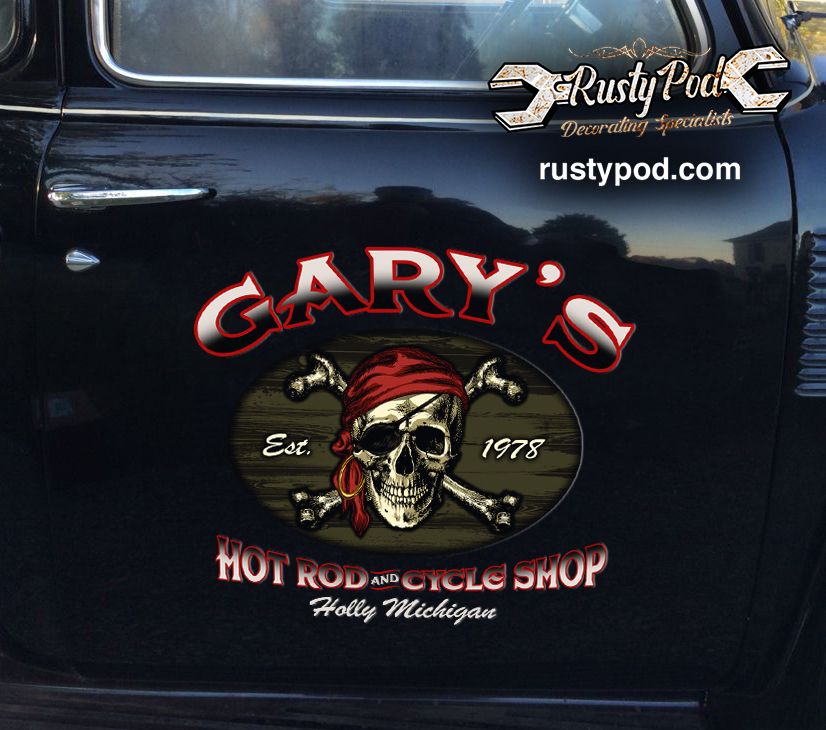 2 pcs personalized hot rod and cycle shop | pirate skull | old school garage set 02 vinyl stickers 09755