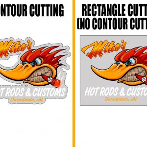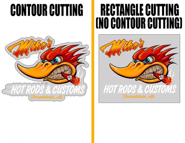 - Contour Cutting/Trim means that the decals are printed with an outline hugging the design. Meanwhile, with no contour cut, the outline will be a rectangle instead, with a length of 21inch.