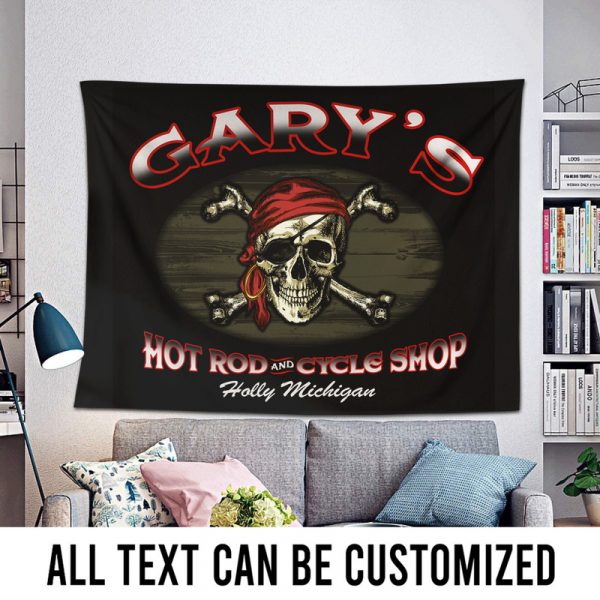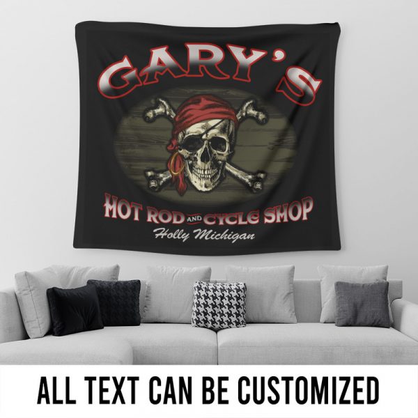 personalized hot rod and cycle shop | pirate skull | old school garage tapestry
