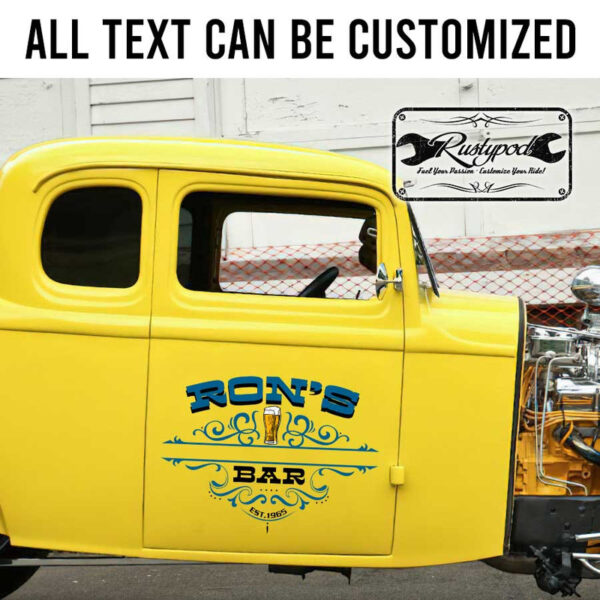 personalized bar sign writing pinstriping art shop truck door art sticker uses advanced UV printing technology on durable vinyl panels.