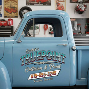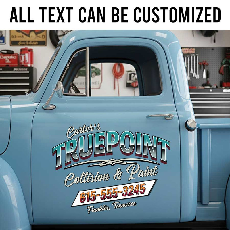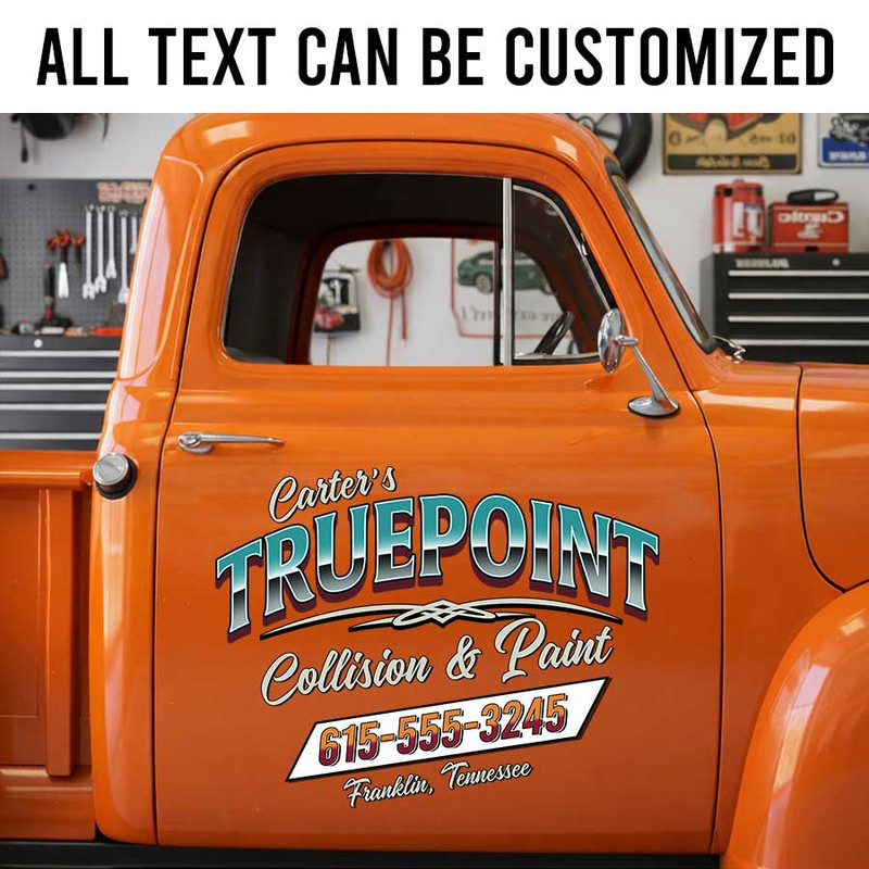 Personalized Body Shop Door Decal with Custom Company Name and Retro Script Style sticker 14253