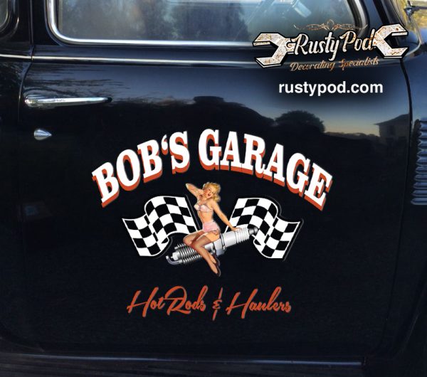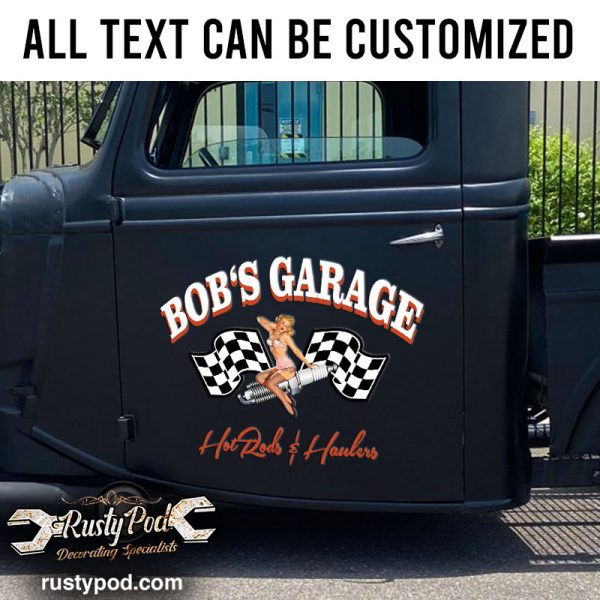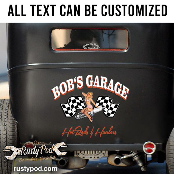Be the first to review “personalized checker flag pin up girl and spark plug lettering vinyl sticker 10590”