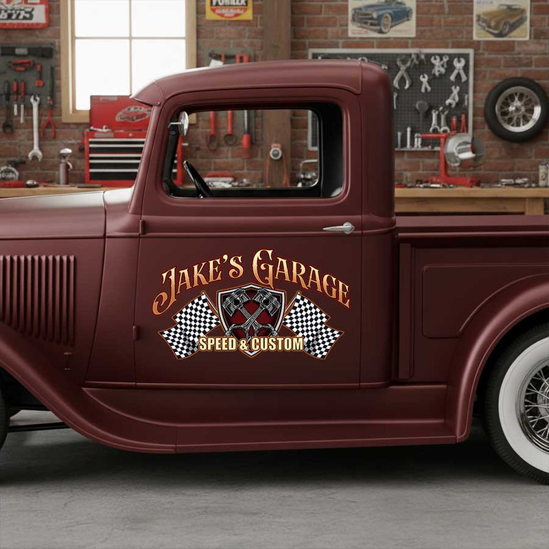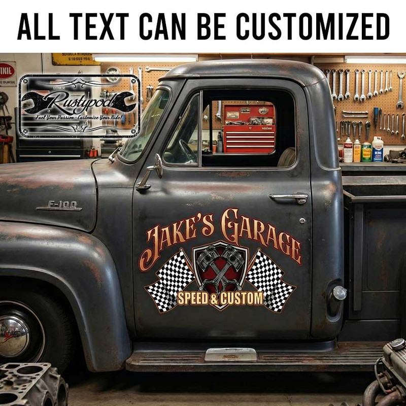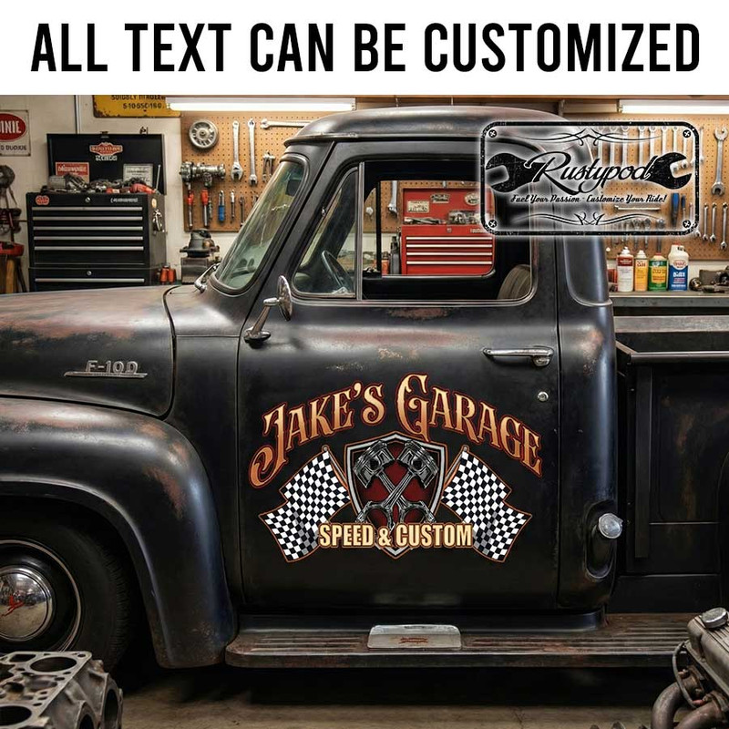 personalized checkered flag lettering decal hot rod decal crossing piston decal speed shop sign sticker utilizes advanced UV printing technology on high-quality vinyl panels, ensuring vivid colors and outstanding durability. The decal boasts excellent resistance to environmental impacts such as sunlight, rain, and scratches, and is completely safe for all vehicle surfaces. Application is quick and hassle-free, making it perfect for both personal and business use. We offer customization according to your unique requirements and provide a contour cut option to remove excess material, creating a painted-on appearance for your sticker. Our products are ideal for cars, motorbikes, glass doors, and more, perfectly suited for showcasing personality or advertising your brand.