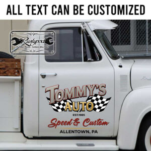 personalized checkered flag lettering speed shop lettering sign speed and custom garage sign hot rod door art sticker is crafted using UV printing technology on high-quality vinyl panels, ensuring long-lasting durability and resistance to environmental factors. This product is safe for vehicle surfaces and easy to apply. Our designs can be customized to your preferences, and you can choose a contour cut option that eliminates excess decal, giving the appearance of a painted design. These decals are suitable for application on cars, motorbikes, glass doors, and more, perfect for expressing personality or promoting your brand.