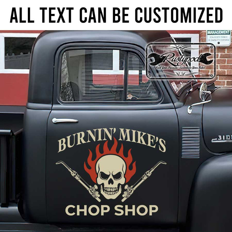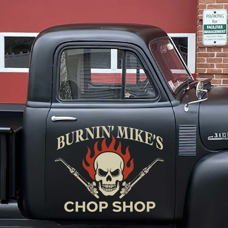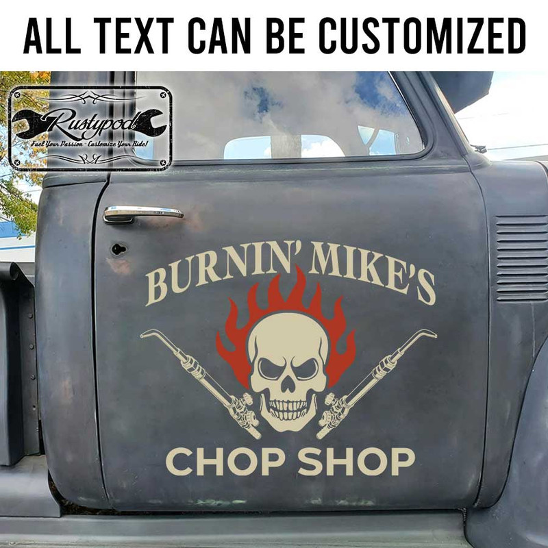 personalized chop shop lettering skull lettering door art repair shop sign sticker utilizes UV printing technology on high-quality vinyl panels, ensuring exceptional durability and resistance to environmental factors. It’s designed to be safe for all vehicle surfaces and incredibly easy to apply.