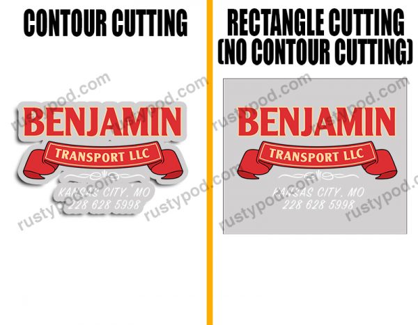 • Contour Cutting/Trim means that the decals are printed with an outline hugging the design. Meanwhile, with no contour cut, the outline will be a rectangle instead.