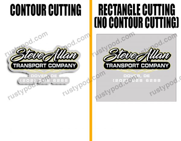 • Contour Cutting/Trim means that the decals are printed with an outline hugging the design. Meanwhile, with no contour cut, the outline will be a rectangle instead.