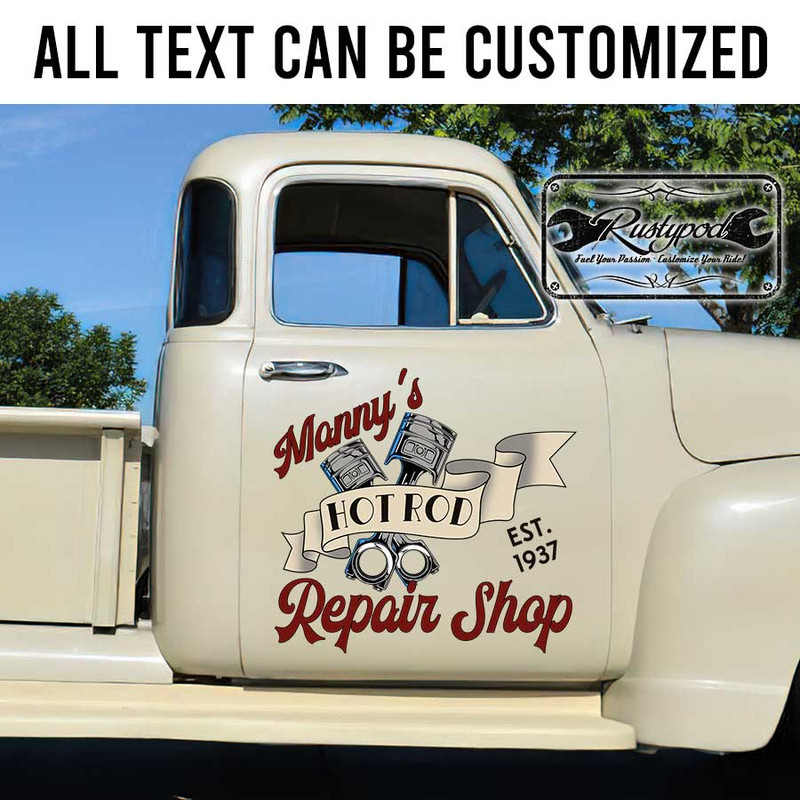personalized crossed piston and ribbon lettering repair shop lettering sign hand paint shop truck door art sticker uses advanced UV printing technology on durable vinyl panels.