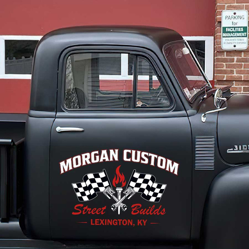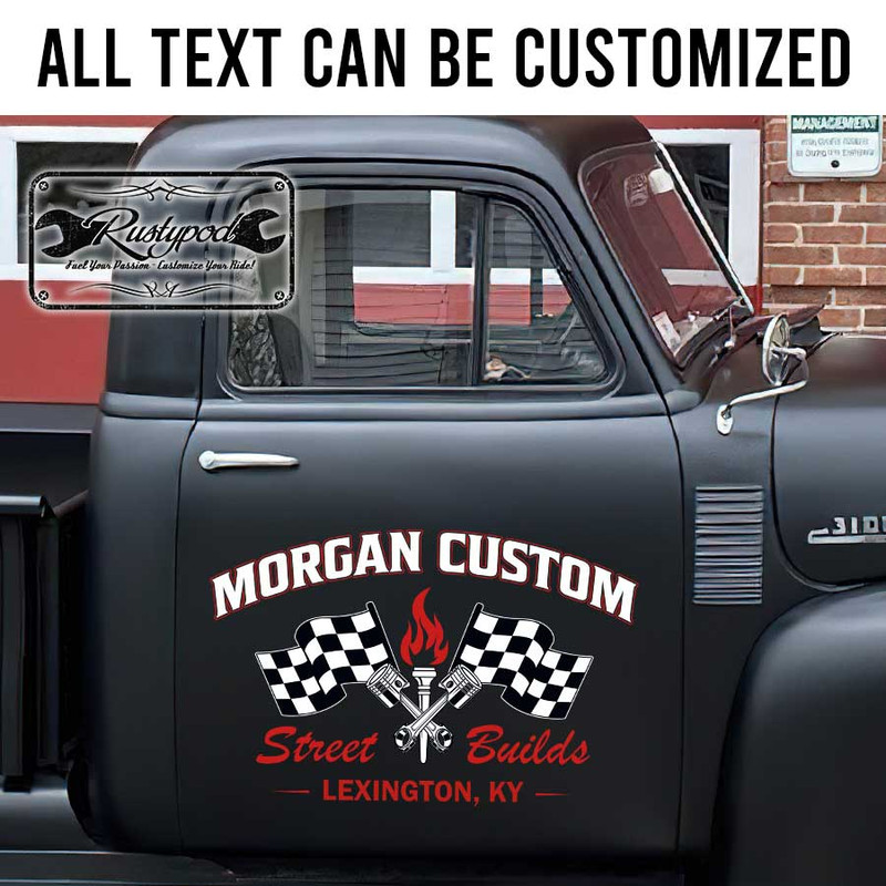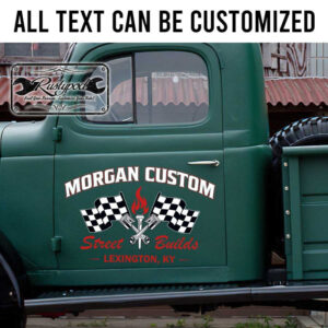 personalized crossing piston and checkered flag hot rod lettering shop truck door art sticker uses advanced UV printing technology on durable vinyl panels. This ensures high durability and strong resistance to environmental impacts.