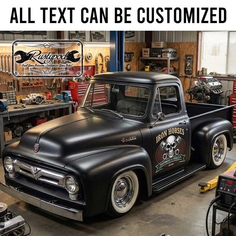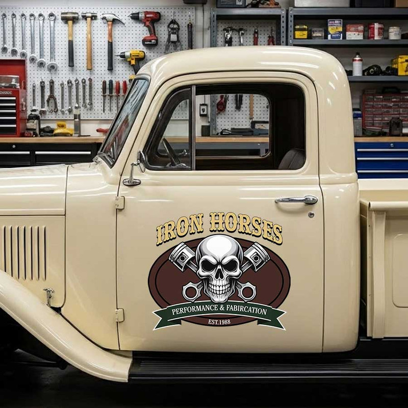 personalized crossing piston and skull lettering decal shop truck door art decal performance garage sign sticker utilizes advanced UV printing technology on durable vinyl panels, ensuring high durability and exceptional resistance to environmental impacts. Our stickers are safe for vehicle surfaces and incredibly easy to apply. Each design is fully customizable to meet your unique requirements, and you can choose the contour cut option to eliminate excess decal, giving your sticker a seamless, painted-on look. These decals are suitable for cars, motorbikes, glass doors, and more—perfect for expressing your personality or advertising your brand.
