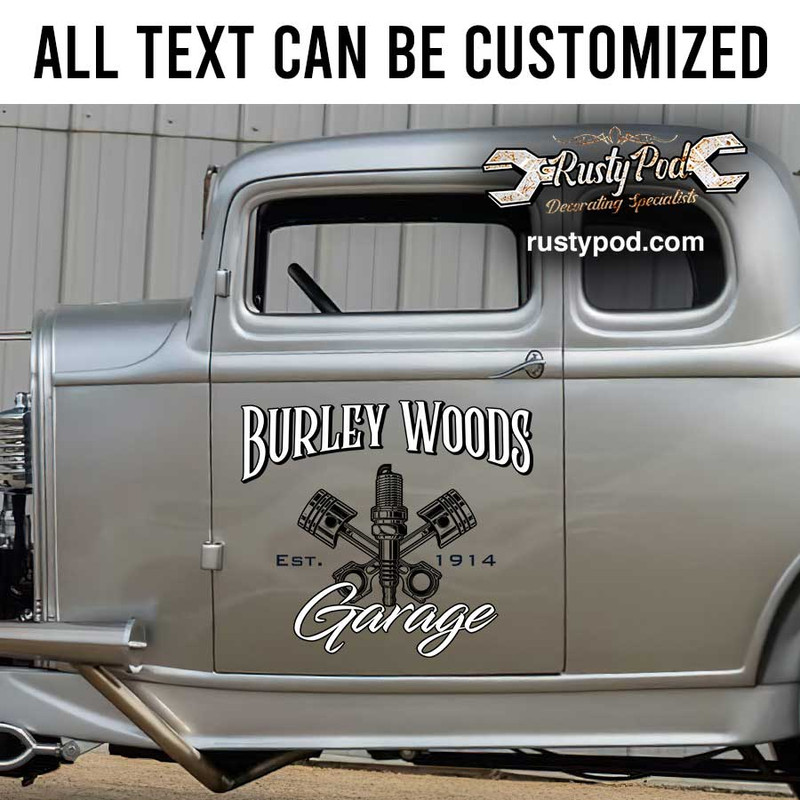 personalized crossing piston and spark plug lettering garage door sign hot rod lettering rat rod door art sticker 12500