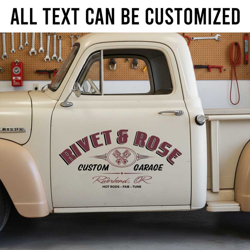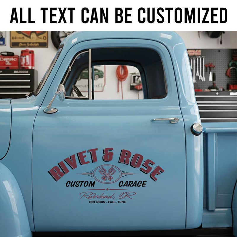 personalized crossing piston lettering decal hot rod lettering decal rat rod door art decal custom garage sign sticker uses UV printing technology on durable vinyl panels, offering strong resistance to environmental impacts and ensuring safety for vehicle surfaces.