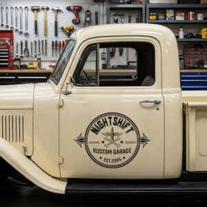 Personalized Custom Garage Car Decal – Vintage Kustom Garage Logo with Tools and Classic Badge Design sticker is produced using advanced UV printing technology on high-quality vinyl panels, ensuring sharp, vibrant visuals and exceptional durability over time.