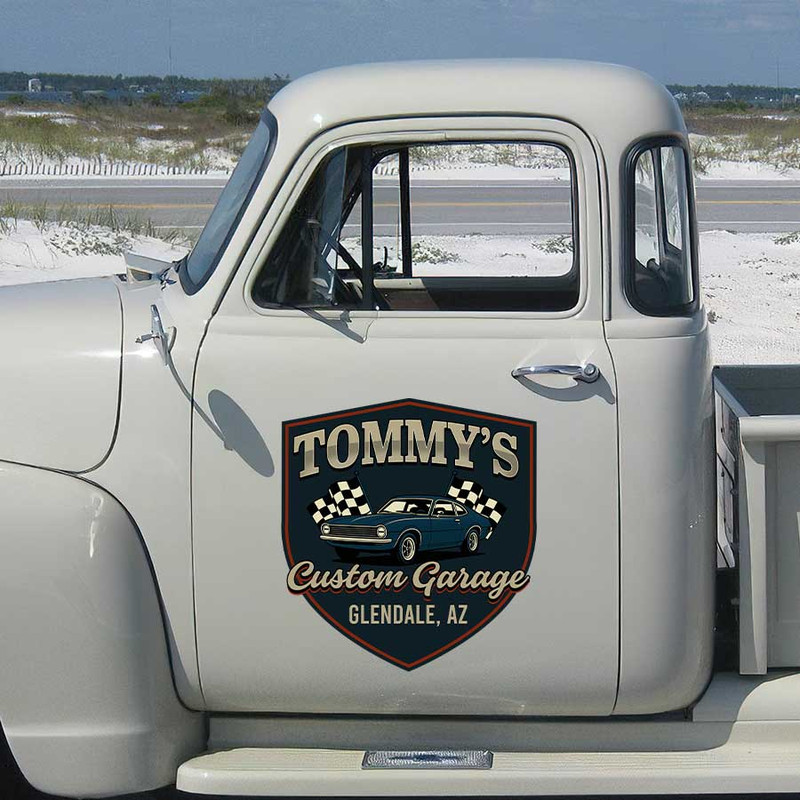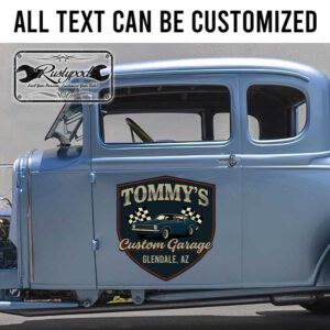 personalized custom garage lettering checkered flag sign speed shop sign muscle car garage sticker uses advanced UV printing technology on durable vinyl panels. This ensures exceptional durability and resistance to environmental impacts while remaining safe for vehicle surfaces.