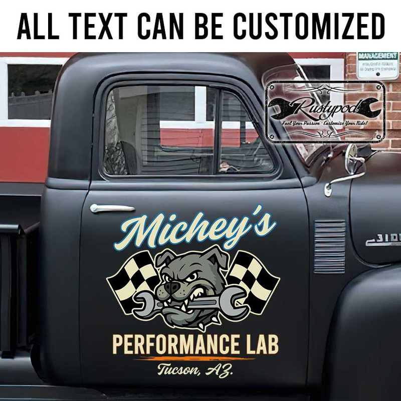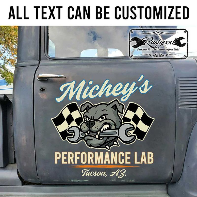 personalized dog and wrench checkered flag lettering sign writing garage door sign sticker 13273