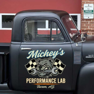 personalized dog and wrench checkered flag lettering sign writing garage door sign sticker utilizes UV printing technology on high-quality vinyl panels, ensuring exceptional durability and resistance to environmental factors. It’s designed to be safe for all vehicle surfaces and incredibly easy to apply.