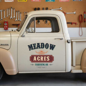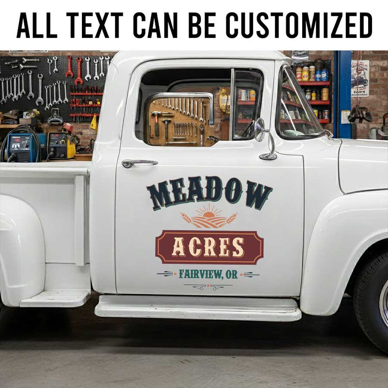 Personalized Farm Vehicle Decal – Vintage Meadow Acres Logo with Sunrise and Wheat for Agricultural Businesses sticker is produced using advanced UV printing technology on high-quality vinyl panels, ensuring sharp, vibrant visuals and exceptional durability over time.