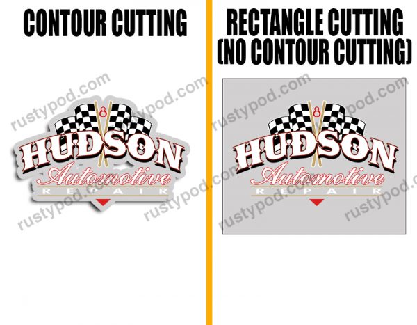 - Contour Cutting/Trim means that the decals are printed with an outline hugging the design. Meanwhile, with no contour cut, the outline will be a rectangle instead.