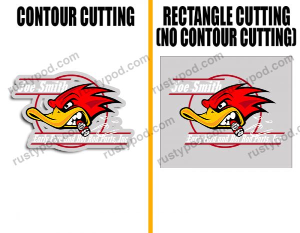 - Contour Cutting/Trim means that the decals are printed with an outline hugging the design. Meanwhile, with no contour cut, the outline will be a rectangle instead.