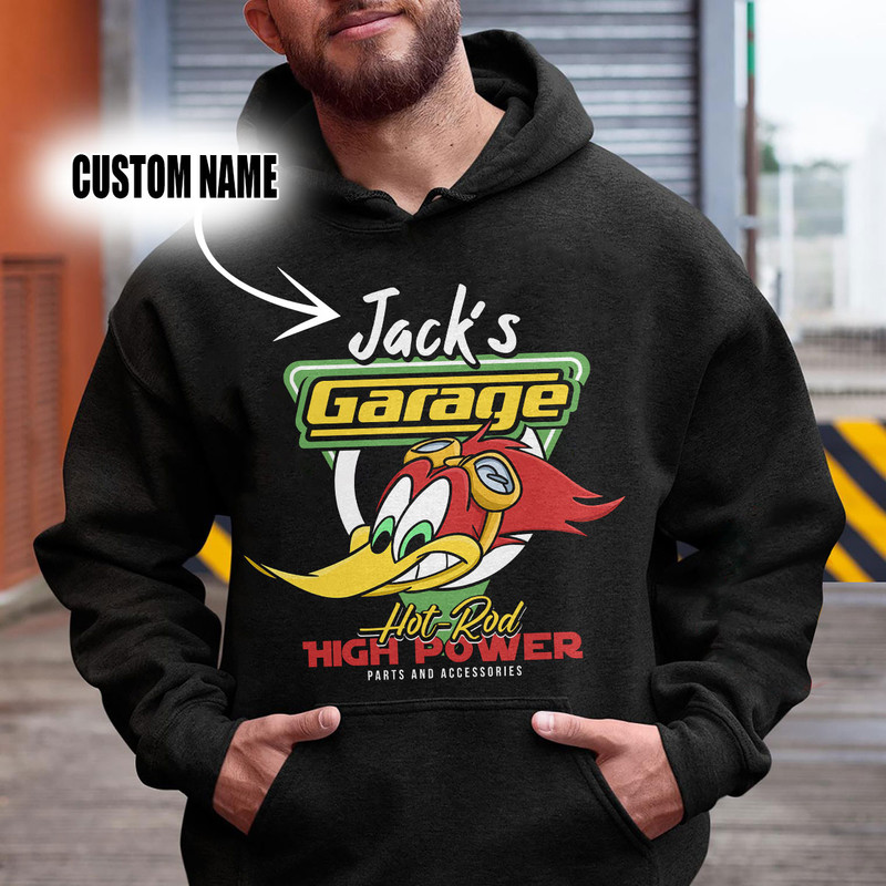 Get ready to hit the road in style – order your personalized hot rod garage| woodpecker hoodie now!