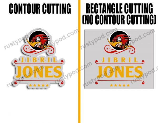 - Contour Cutting/Trim means that the decals are printed with an outline hugging the design. Meanwhile, with no contour cut, the outline will be a rectangle instead.