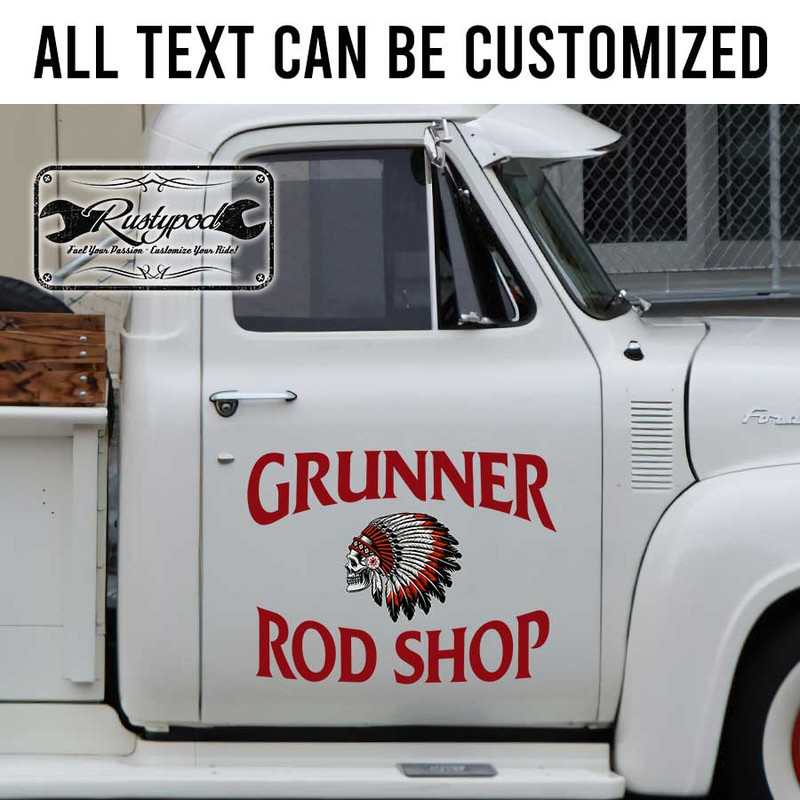 personalized hot rod native american lettering sign chief lettering shop truck door art sticker uses advanced UV printing technology on durable vinyl panels.