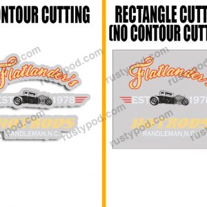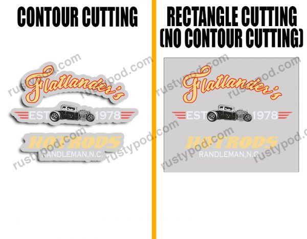 - Contour Cutting/Trim means that the decals are printed with an outline hugging the design. Meanwhile, with no contour cut, the outline will be a rectangle instead.