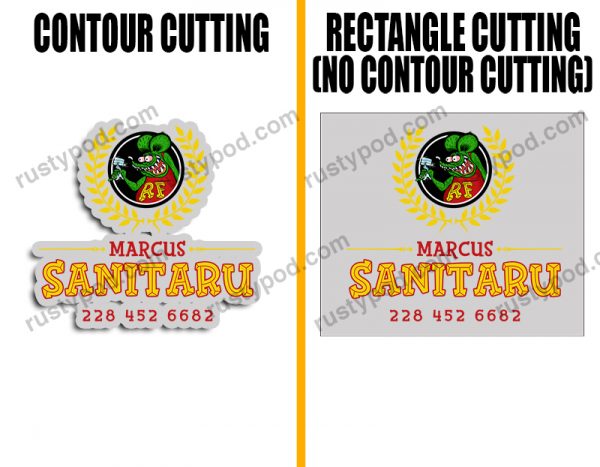 - Contour Cutting/Trim means that the decals are printed with an outline hugging the design. Meanwhile, with no contour cut, the outline will be a rectangle instead.
