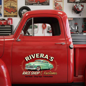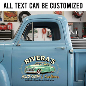 personalized hot rod shop lettering decal pinstriping art decal race shop sign decal kustom kulture sticker uses advanced UV printing technology on durable vinyl panels.