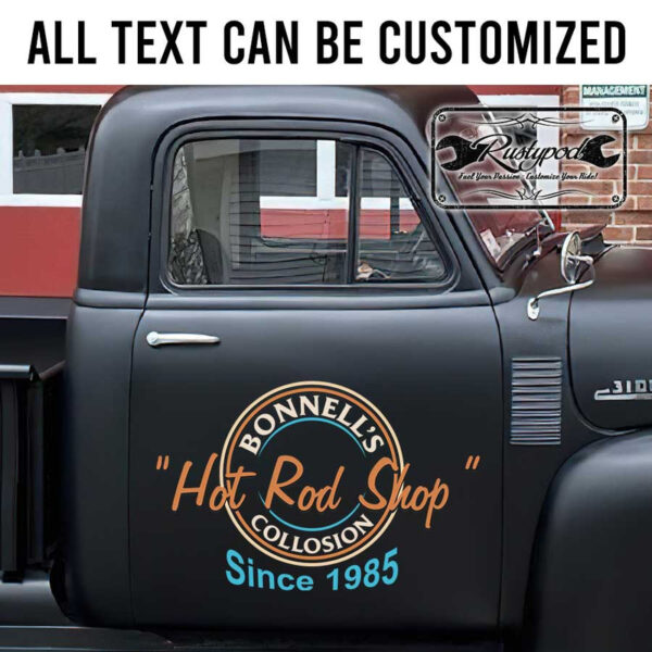 personalized hot rod shop lettering rat rod lettering door sign kustom kulture sign writing sticker uses advanced UV printing technology on durable vinyl panels.