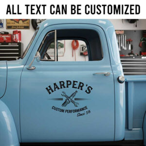 personalized hot rod sticker spark plug and wrench lettering decal shop truck door art sticker uses UV printing technology on durable vinyl panels, offering strong resistance to environmental impacts and ensuring safety for vehicle surfaces.