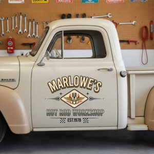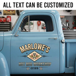 Personalized Hot Rod Workshop Truck Door Decal with Custom Name and Winged Piston Emblem sticker 14260 is perfectly tailored for you if you love all things piston sticker. Built using industry-leading materials, our decal guarantees rigorous durability to last you for years. Feel confident in its lasting power, as it is fully fortified against water splashes, direct sunlight exposure, and harsh environmental wear.