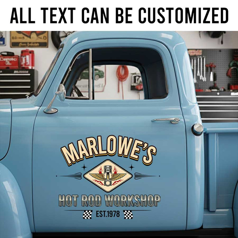 Personalized Hot Rod Workshop Truck Door Decal with Custom Name and Winged Piston Emblem sticker 14260