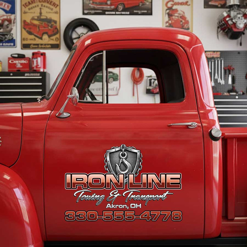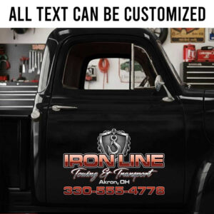 Personalized Iron Line Towing Service Truck Door Logo Decal with Hook Emblem for Tow Operators and Transport Businesses sticker is produced using advanced UV printing technology on high-quality vinyl panels, ensuring sharp, vibrant visuals and exceptional durability over time.