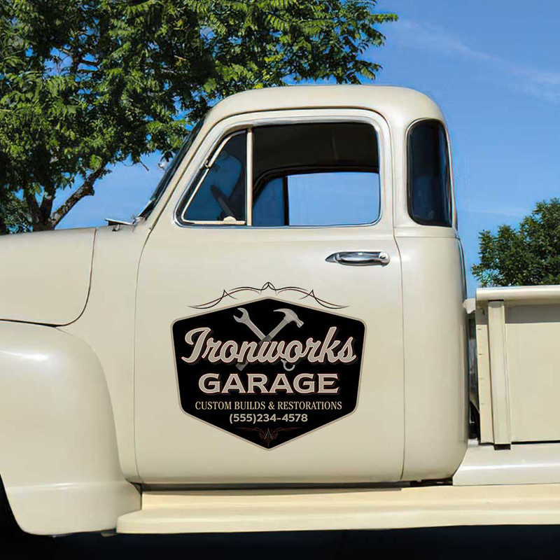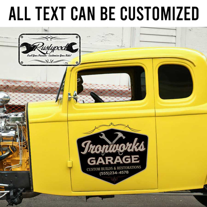 personalized ironwork garage sign decal custom builds garage lettering decal restoration garage lettering wrench and hammer logo sticker utilizes advanced UV printing technology on premium vinyl panels, ensuring outstanding durability and vibrant colors. These decals are designed to resist harsh environmental impacts, making them a safe choice for any vehicle surface. Application is quick and easy, and the material ensures no damage or residue is left behind. Each design can be customized to suit your unique requirements, with contour cut options that trim excess decal for a painted-on look. Perfect for cars, motorbikes, glass doors, and more, these decals let you express your personality or advertise your brand with style.
