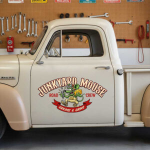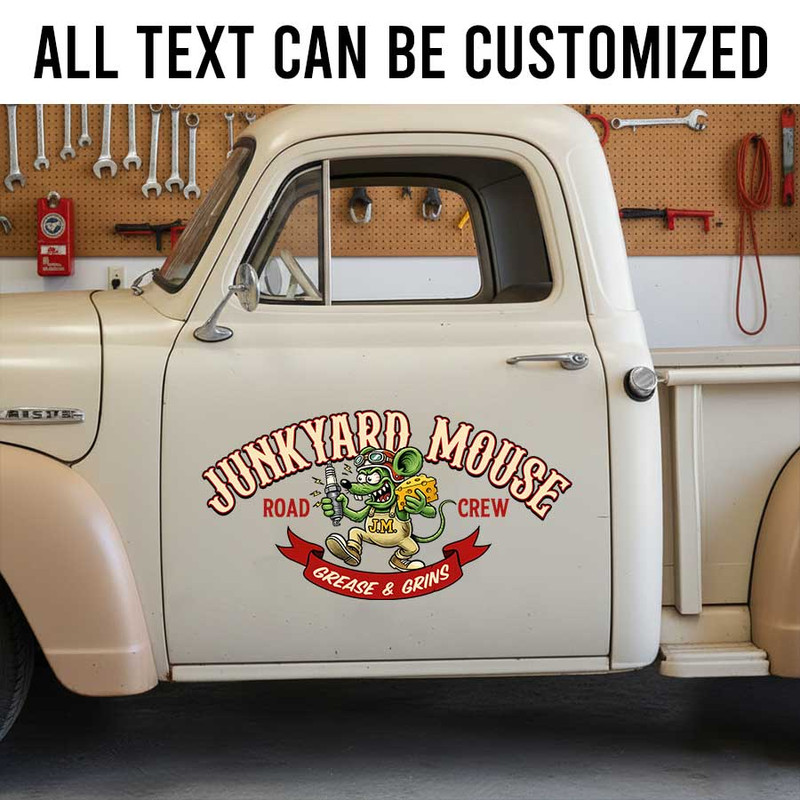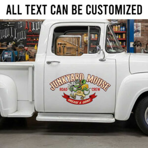 personalized junkyard lettering decal rat fink lettering door sign decal kustom kulture sticker is crafted using advanced UV printing technology on durable vinyl panels.