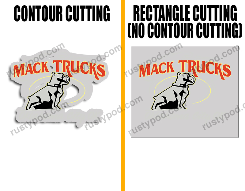 • Contour Cutting/Trim means that the decals are printed with an outline hugging the design. Meanwhile, with no contour cut, the outline will be a rectangle instead.