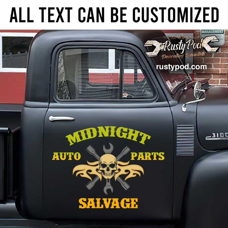personalized midnight salvage skull lettering door art lettering wrench lettering shop truck door art sticker uses advanced UV printing technology on durable vinyl panels, ensuring long-lasting designs