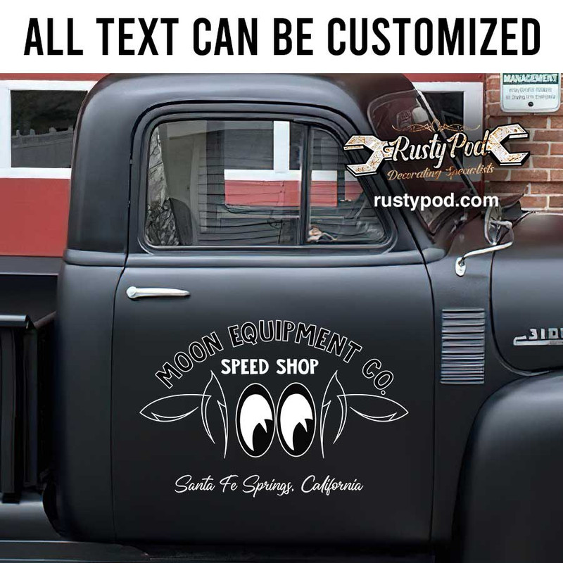 personalized moon equipmen company speed shop hot rod sign pinstriping lettering sticker 12962