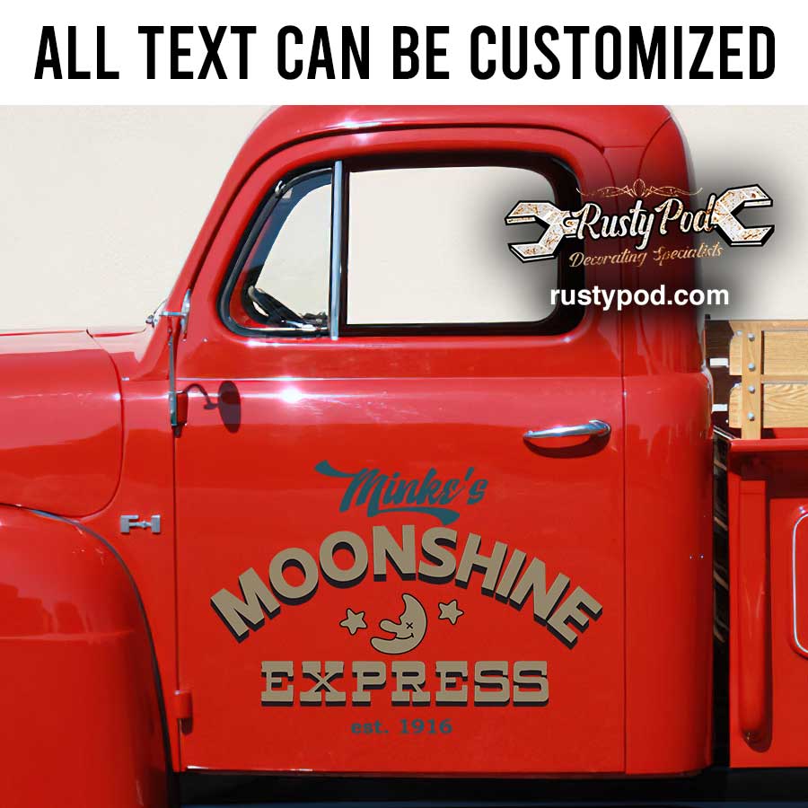 personalized moonshine express hot rod lettering rat rod door art shop truck lettering car lettering sticker utilizes advanced UV printing technology on durable vinyl panels.