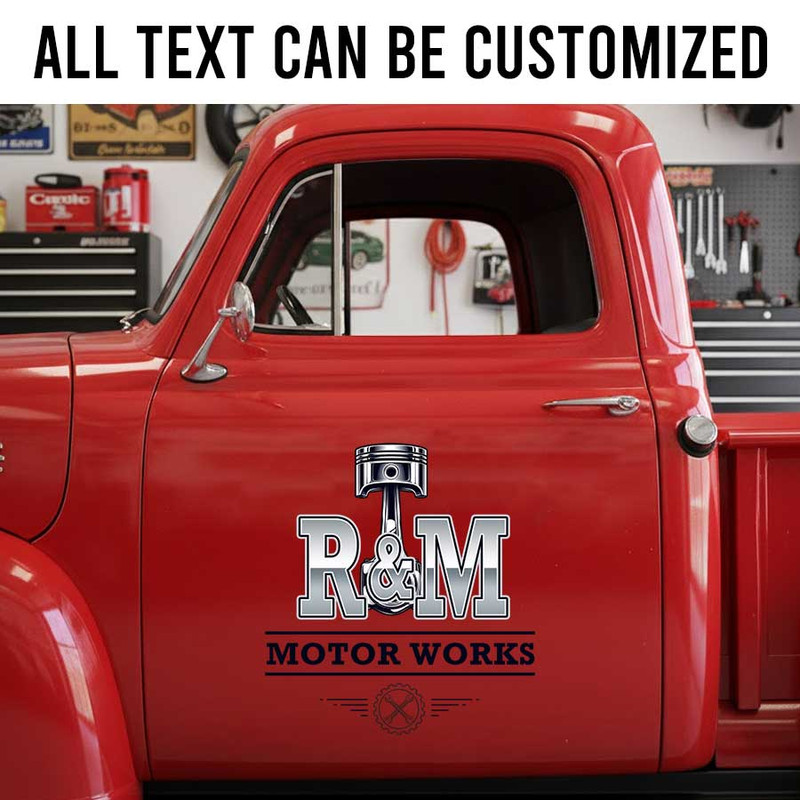 Personalized Motor Works Truck Door Decal with Custom Initials and Piston Graphic sticker 14242