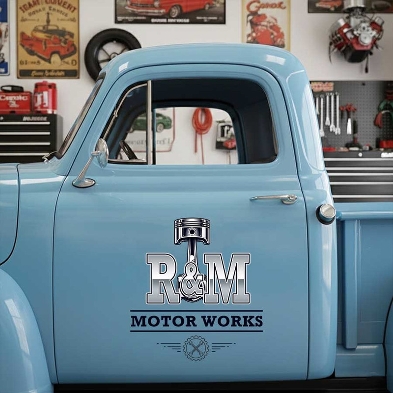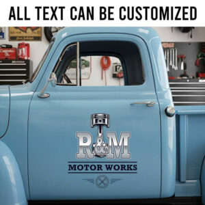 Personalized Motor Works Truck Door Decal with Custom Initials and Piston Graphic sticker 14242 is perfectly tailored for you if you love all things piston sticker. Built using industry-leading materials, our decal guarantees rigorous durability to last you for years. Feel confident in its lasting power, as it is fully fortified against water splashes, direct sunlight exposure, and harsh environmental wear.