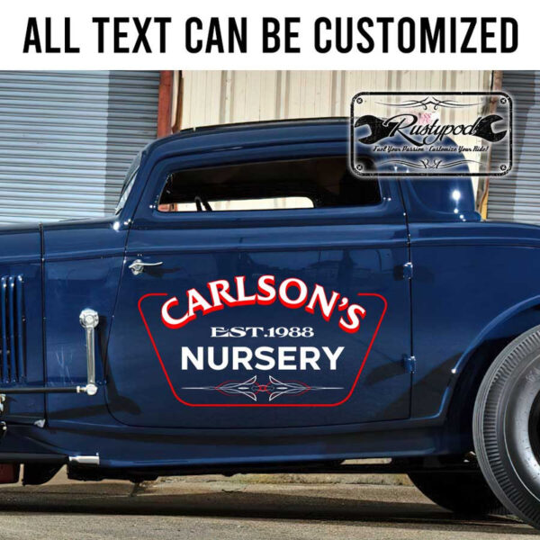personalized nursery lettering pinstriping art hot rod sign vintage hot rod door art patina sign sticker uses advanced UV printing technology on durable vinyl panels.