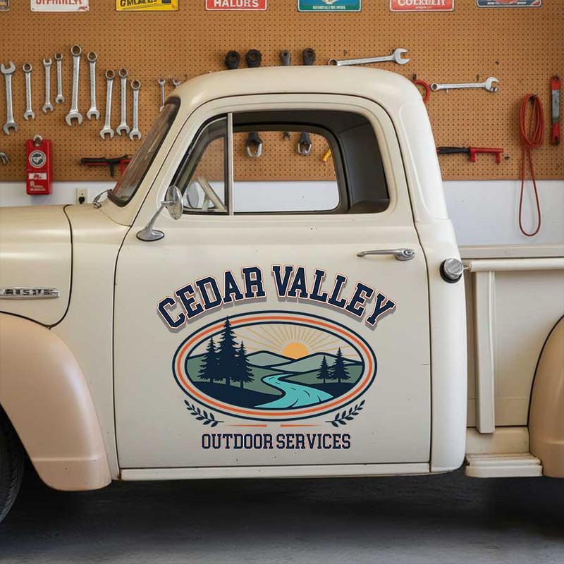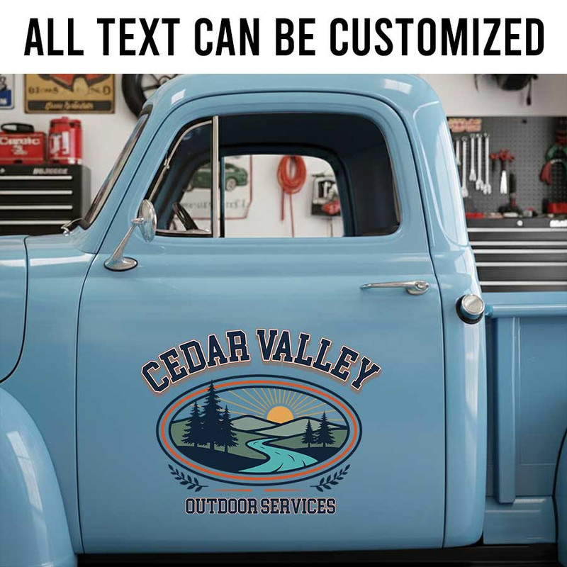 Personalized Outdoor Services Truck Door Decal with Custom Business Name and Scenic Landscape Badge sticker 14257