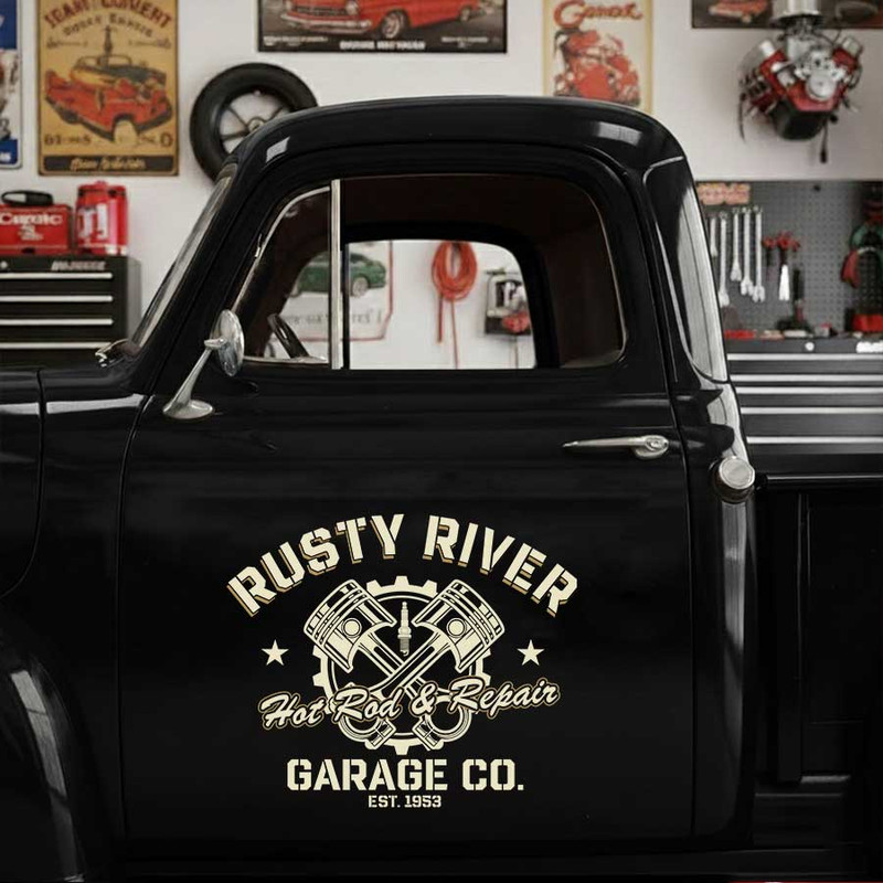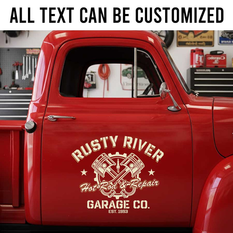 personalized patina truck lettering decal gearhead and piston lettering decal hot rod sticker uses advanced UV printing technology on durable vinyl panels.