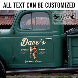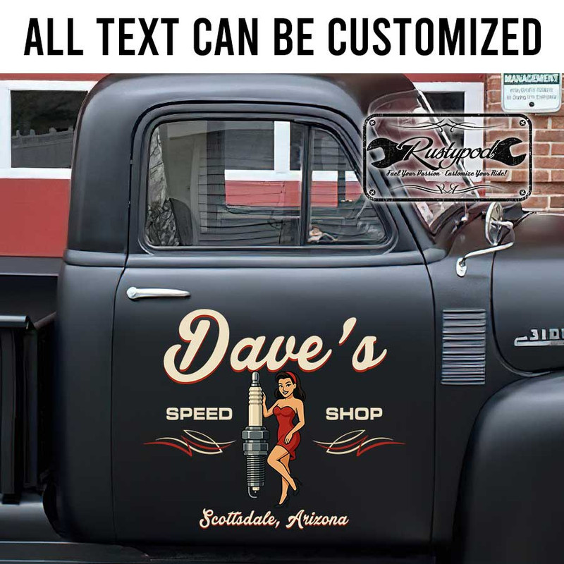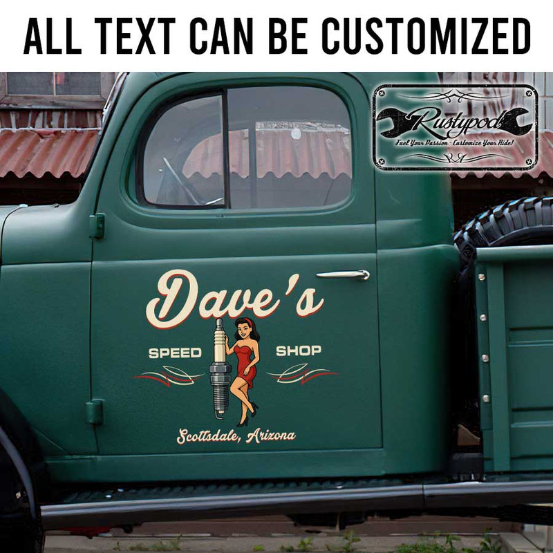 personalized pin up girl and spark plug lettering hot rod sign speed shop lettering hot rod lettering sticker 13250