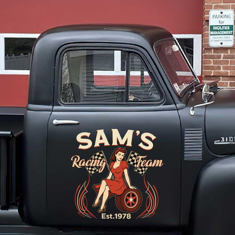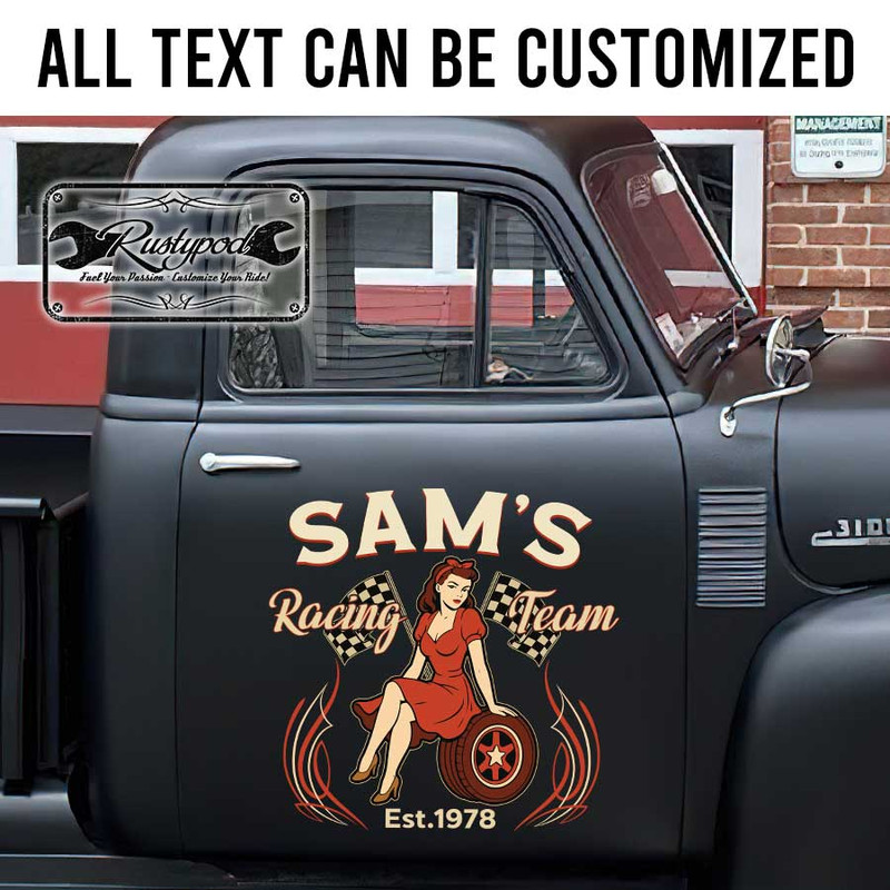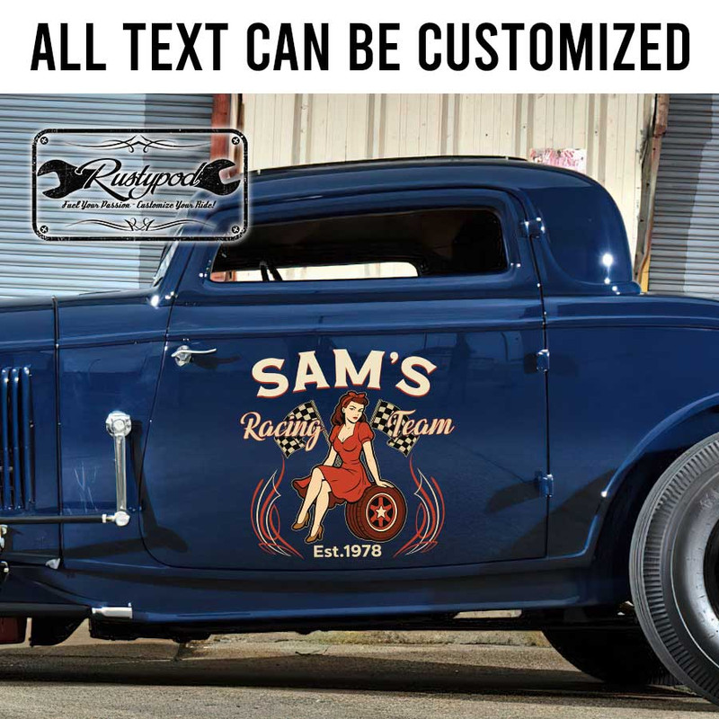 personalized pin up girl and wheels lettering checkered flag lettering sign racing car door sign sticker uses advanced UV printing technology on durable vinyl panels. This ensures high durability and strong resistance to environmental impacts.