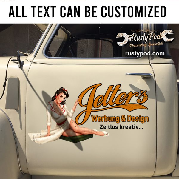 Infuse your favorite vehicle with personality and flair using our exclusive Personalized Pin-Up Girl Lettering Sticker 11118. Crafted with top-notch materials, this sticker possesses exceptional quality and durability, making it impervious to harsh weather conditions such as rain or direct sunlight.