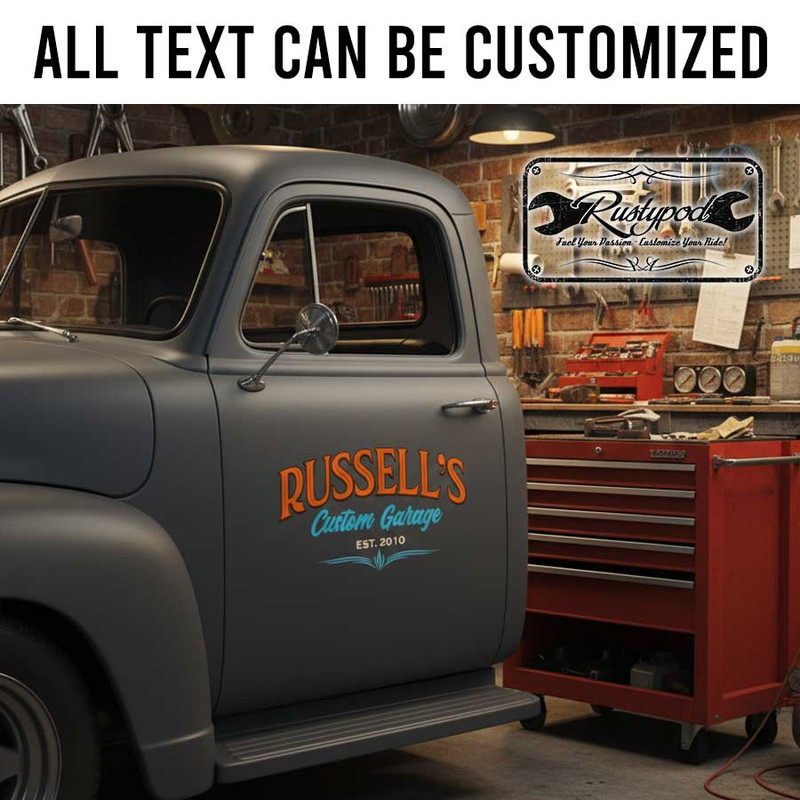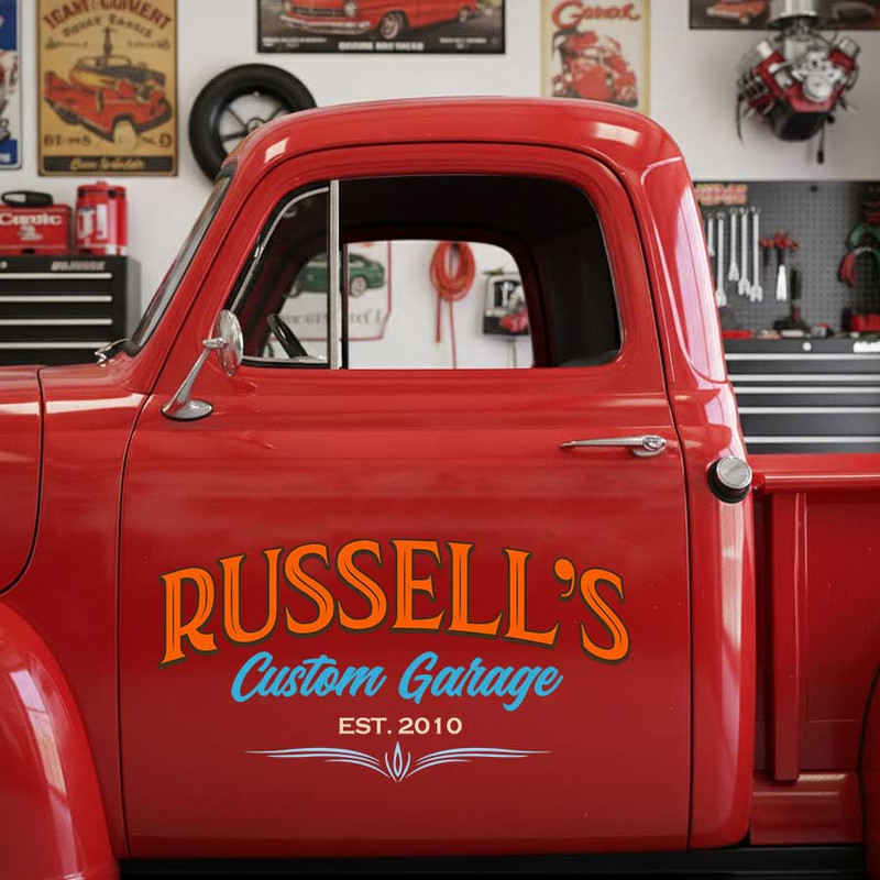 personalized pinstriping art custom garage sign decal hot rod garage lettering sign decal muscle car lettering sticker utilizes advanced UV printing technology on durable vinyl panels, ensuring high durability and exceptional resistance to environmental impacts. Our stickers are safe for vehicle surfaces and incredibly easy to apply. Each design is fully customizable to meet your unique requirements, and you can choose the contour cut option to eliminate excess decal, giving your sticker a seamless, painted-on look. These decals are suitable for cars, motorbikes, glass doors, and more—perfect for expressing your personality or advertising your brand.