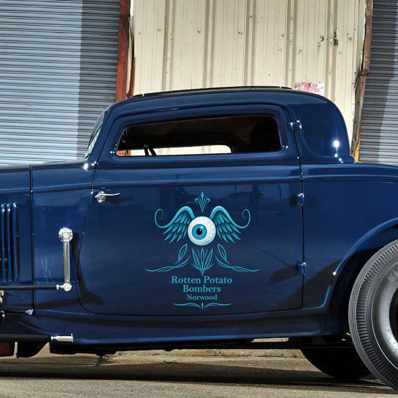 personalized pinstriping art flying eyeball lettering decal kustom kulture hot rod sticker utilizes advanced UV printing technology on durable vinyl panels, ensuring high durability and exceptional resistance to environmental impacts. Our stickers are safe for vehicle surfaces and incredibly easy to apply. Each design is fully customizable to meet your unique requirements, and you can choose the contour cut option to eliminate excess decal, giving your sticker a seamless, painted-on look. These decals are suitable for cars, motorbikes, glass doors, and more—perfect for expressing your personality or advertising your brand.